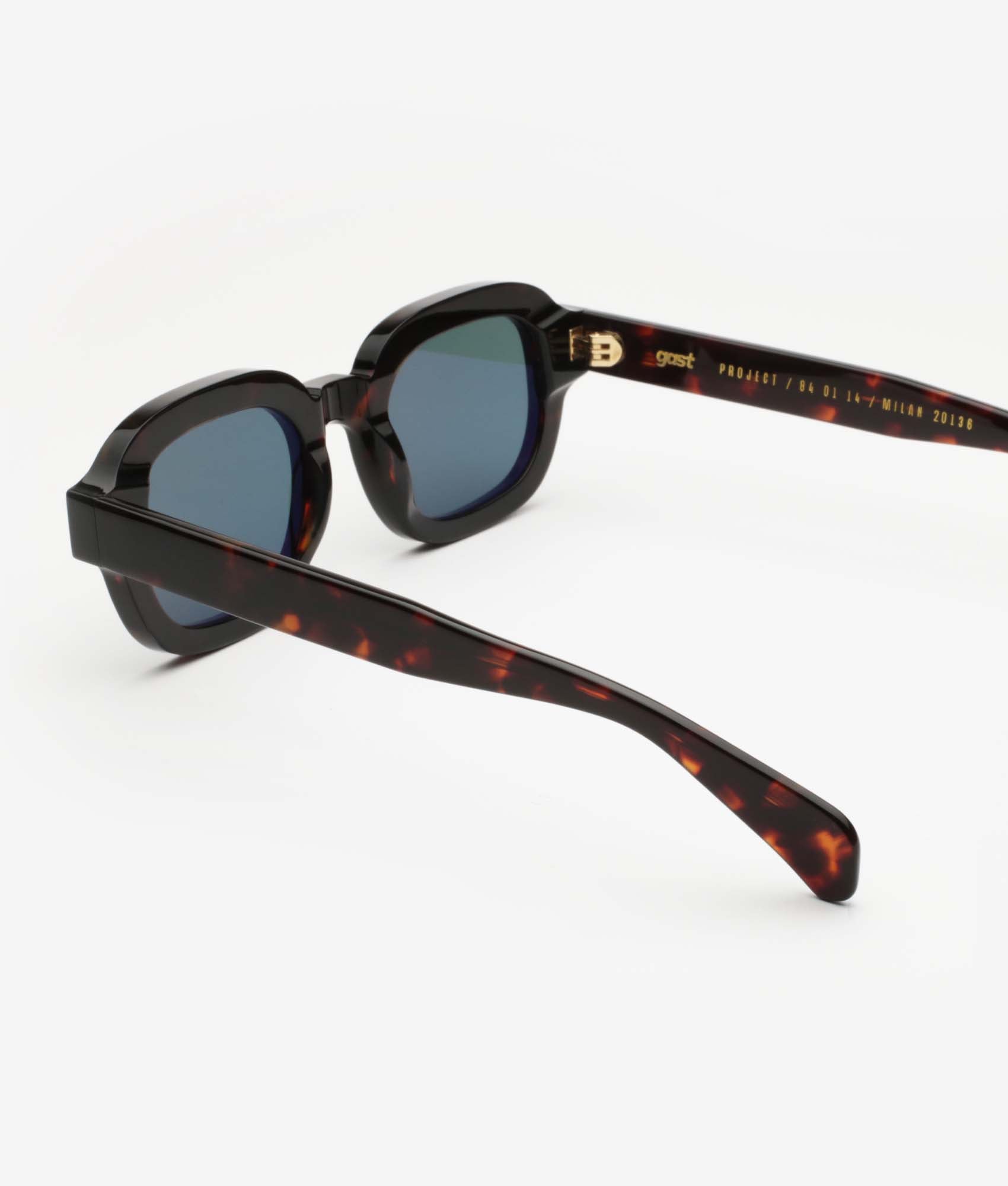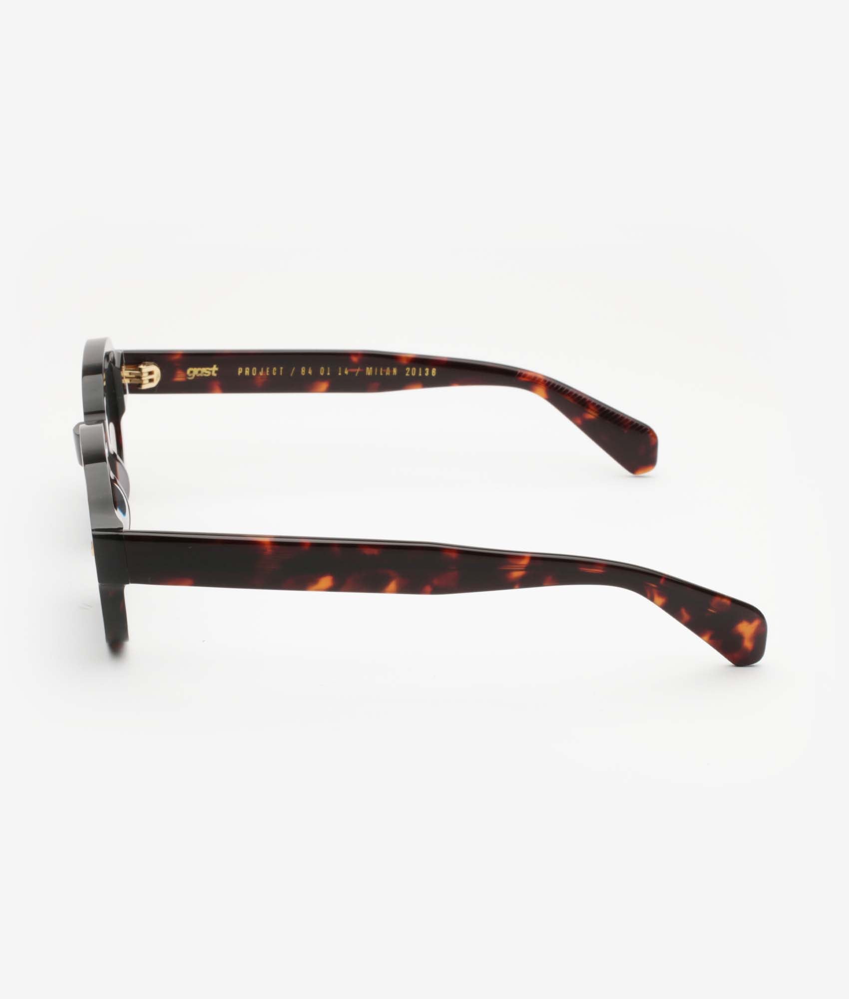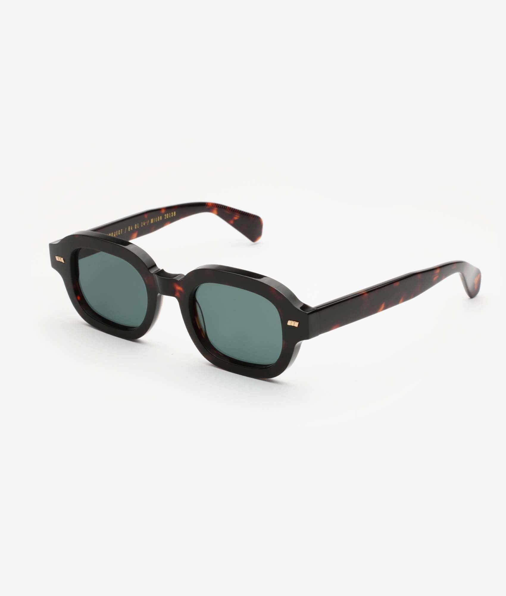 Handmade sunglasses with havana acetate frame and green semi-flat nylon lenses with anti-reflective inside coating – 100% UVA / UVB protection. Five barrels metal hinges. Premium hard case and microfiber cleaning cloth.